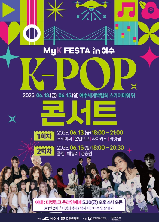 K-팝 콘서트는 1회차(6월 13일)와 2회차(6월 15일) 걸쳐 여수세계박람회장 스카이타워 뒤편 특설무대에서 열린다.