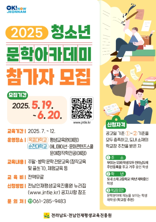 범희승 전남인재평생교육진흥원장은 “문학에 재능과 감수성을 지닌 청소년이 자신의 가능성을 펼치고, 지역 문학의 미래를 이끌 인재로 성장하도록 적극 지원하겠다”며 “전남만의 차별화된 인재육성 모델로 자리매김토록 최선을 다하겠다”고 말했다.