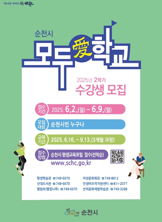 모두愛학교는 순천시민의 평생교육을 지원하는 대표적인 프로그램으로, 강의는 평생학습관, 여성문화회관, 인생이모작지원센터, 선비문화체험학습관, 신대도서관, 별량초 별빛나루 등 6개 기관에서 진행되며, 기관별 특성을 반영한 프로그램을 통해 다양한 계층과 연령층의 시민이 참여할 수 있도록 구성됐다.