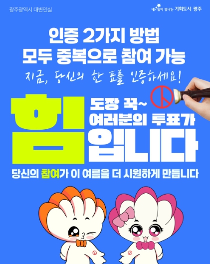 광주광역시는 사전투표 첫날인 5월 29일부터 본투표일인 6월 3일까지 6일간 전 국민을 대상으로 공식 SNS 계정을 통한 ‘투표 인증 이벤트’를 진행한다.