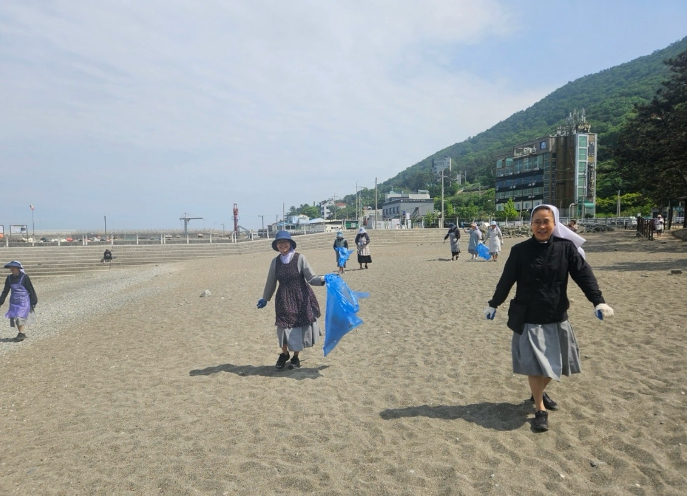 이날 수녀들은 해변 곳곳에 버려진 폐스티로폼과 폐플라스틱, 비닐 등 해양쓰레기를 꼼꼼히 수거했다.