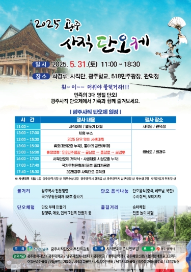 이번 광주사직단오제는 ‘법고창신 사직전통–솟아라 단오’를 주제로, 전통의 가치를 현대적으로 되살려 남녀노소 누구나 즐길 수 있는 전통문화 향유의 장으로 꾸며진다.