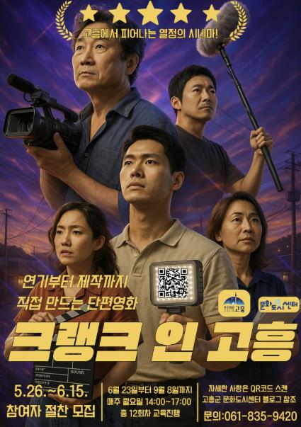 모집 대상은 단편영화 제작에 관심 있는 만 19세 이상 고흥군 거주자 20명이며, 신청은 이메일 또는 방문 접수를 통해 가능하다. 참가비는 무료이며, 기타 자세한 사항은 고흥군 문화도시센터 블로그에서 확인할 수 있다.