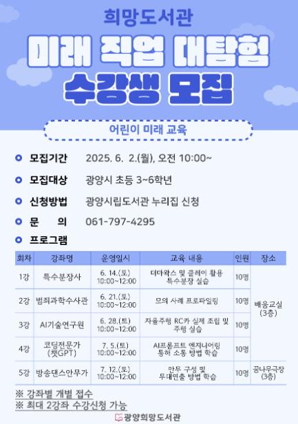 김미라 광양시 도서관과장은 “아이들이 다양한 진로를 체험하며 본인의 적성과 흥미를 찾길 바란다”며 “앞으로도 체험 중심의 미래교육 프로그램을 지속적으로 운영해 나가겠다”고 말했다.
