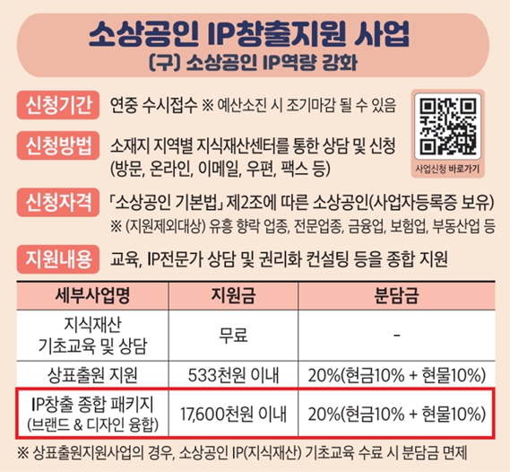 이 사업은 ▲브랜드(네이밍, 로고, 캐릭터 등), 디자인(포장 등) 응용 및 개발 ▲컨설팅 ▲상표(IP) 교육 ▲상표 및 디자인 출원 등을 통해 소상공인의 지식재산 보호를 목표로 종합 서비스를 제공한다.
