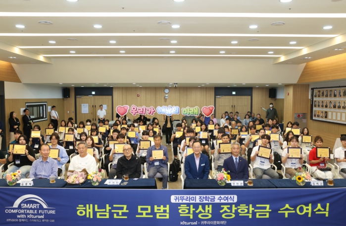 귀뚜라미 그룹 최진민 회장과 문화재단 관계자들이 참석한 가운데 열린 수여식에서는 해남군 중·고·대학생 70명에게 총 5,000만원의 장학금과 장학증서가 전달됐다.