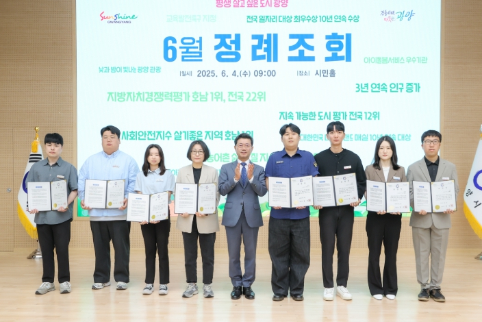 이어 “광양시는 대통령 소속 농어업·농어촌특별위원회가 발표한 농어촌 삶의 질 지수에서 도농복합도시 중 2년 연속 호남 1위를 기록했고, 2025년 전라남도 지방세정평가 최우수상 수상, 개인정보보호위원회의 2024년 개인정보 보호수준 평가 A등급 획득 등 다양한 분야에서 의미 있는 성과를 거뒀다”며 “이 모든 성과는 공직자 여러분의 노력과 헌신 덕분”이라고 격려했다.
