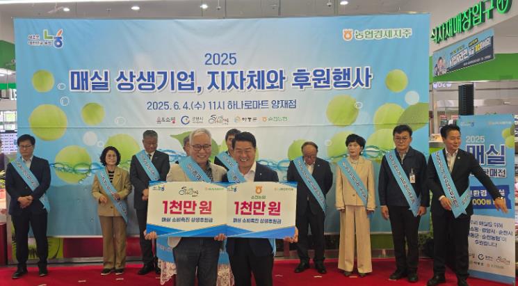 농협경제지주 주관으로 열린 이번 행사는 ㈜홈앤쇼핑(5천만 원), 순천시(1천만 원), 광양시(2천만 원), 하동군(1천만 원), 순천농협(1천만 원)이 공동으로 상생후원금 총 1억 원을 조성했다.