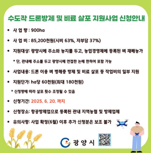 우미자 광양시 스마트원예과장은 “기후변화로 각종 병해충 발생이 증가하고 있어 적기 방제가 무엇보다 중요하다”며 “사업 확정 시기인 6월 말 이후에는 신청이 불가하므로 반드시 기간 내에 신청해 주시길 바란다”고 당부했다. 이어 “고품질 쌀 생산은 물론, 농촌지역의 노동력 부족 해소와 경영비 절감에 기여할 수 있도록 최선을 다하겠다”고 밝혔다.