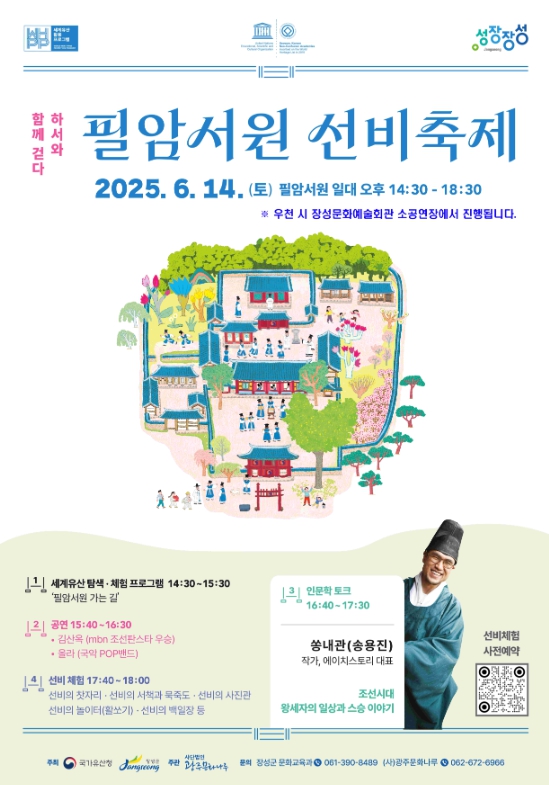 국가유산청과 장성군이 공동 주최하고 (사)광주문화나루가 주관하는 세계유산 활용 공모사업 ‘하서와 함께 걷다 : 필암서원 선비축제’가 오는 14일 필암서원 일원에서 개최된다. 앞선 5월에 이은 두 번째 행사다.