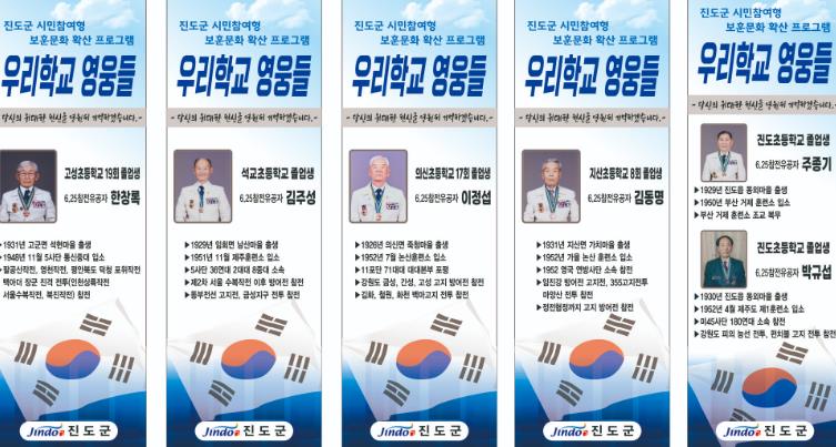 생존해 계신 35명의 관내 6.25참전 유공자에 대한 전수조사를 통해 출신학교와 참전 기록을 수집하고, 사업 참여 의사가 확인된 참전유공자 6명의 출신학교(진도초, 고성초, 의신초, 석교초, 지산초) 5개소에 6월 한 달 동안 안내판(홍보 배너)을 설치해 후배 학생들에게 영웅들을 소개한다.