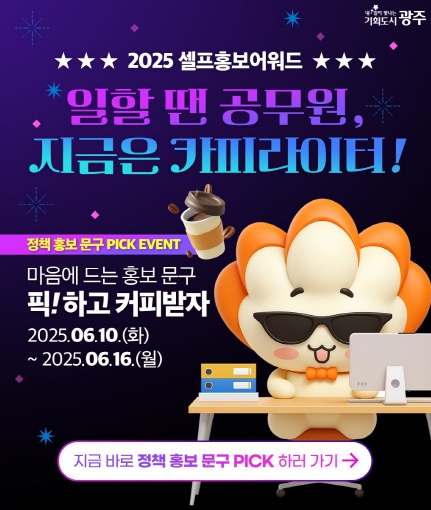‘셀프홍보어워드’는 광주시 정책담당자가 자신이 맡은 정책을 소개한 홍보문구 중 가장 인상 깊은 문구에 시민이 직접 투표하는 시민참여형 온라인 이벤트이다.