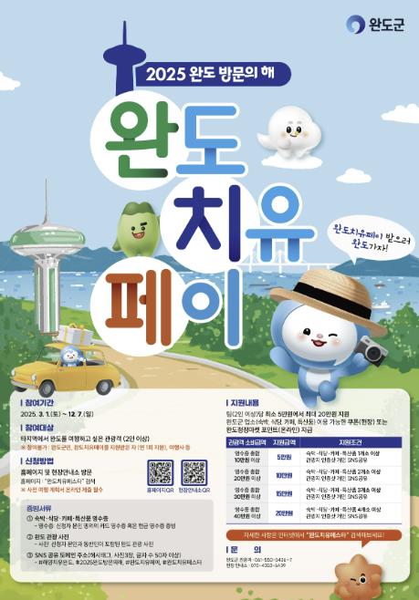 조사 분야는 ▲방문 인지도 ▲완도 치유 페이 만족도 ▲여행 선호도 ▲관광 불편 사항 등 20개 문항에 대해 실시했다.