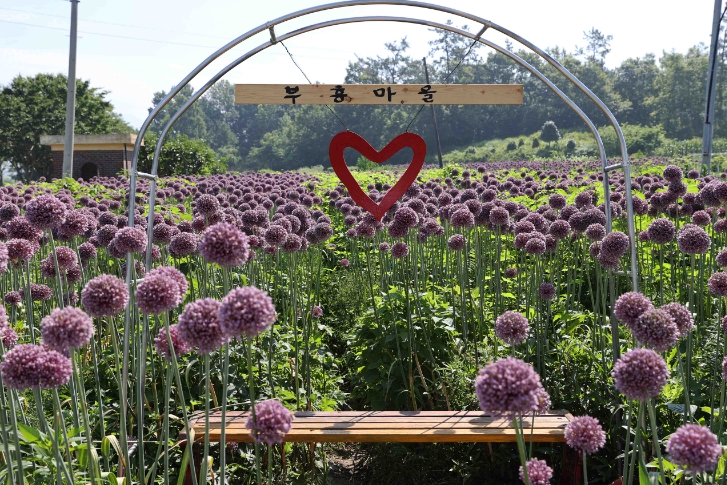 약 4ha 규모의 재배단지에는 코끼리마늘꽃뿐 아니라 메밀, 버들마편초, 장미 등이 어우러져 장관을 이룬다.