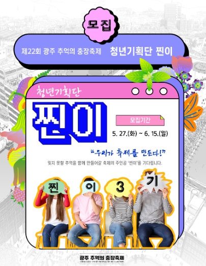 청년기획단 ‘찐이’는 '진국'이라는 단어에서 착안한 명칭으로, 축제의 주인공이 돼 진(Jean·청바지)을 입고 ‘찐’한 기억을 남기며 축제의 한 획을 그어줄 강력한 존재들을 의미한다. 이번 3기는 광주광역시에서 활동하는 만 19세 이상 39세 이하의 대학생과 청년 30명이 대상이다.