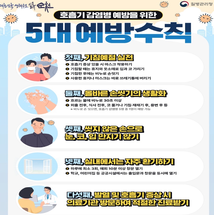 이에 따라 시는 올바른 손씻기와 기침예절 등 개인위생 수칙 준수를 강조하고, 특히 어린이집과 유치원, 학교 등 소아 집단시설에서는 환경 표면을 정기적으로 소독하는 등 예방 조치를 철저히 이행해 줄 것을 당부했다.