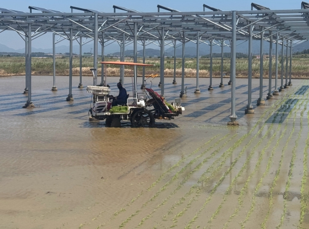 군은 산이면 간척 내 벼 재배지 3,000㎡ 부지에 1,000㎡ 면적의 영농형태양광 시설을 설치하고, 지난주 모내기 작업을 마쳤다.