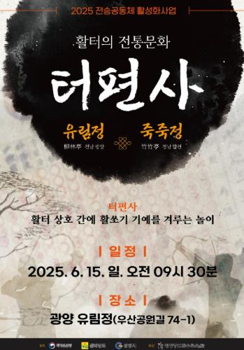 앞서 5월 25일에는 [활터페스티벌]이 성황리에 개최됐으며, 이후 ▲[예를 품어 활을 쏘다], ▲[활터의 전통문화 터편사], ▲[전통활쏘기 포럼] 등 광양의 활쏘기 전승과 확산을 위한 다양한 프로그램이 이어질 예정이다.