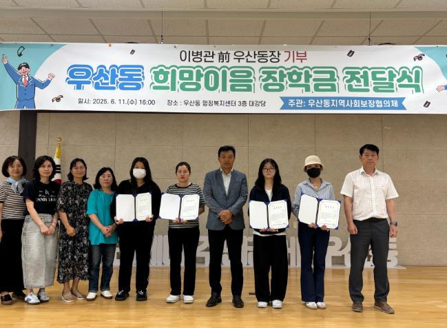 구희숙 우산동 지사협 위원장은 “이병관 전 동장님의 따뜻한 기부로 올해도 지역 청소년에게 희망을 전하는 장학금 지원을 이어가게 됐다”며 “청소년의 꿈과 희망을 응원하는 후원과 나눔이 더욱 활발해지도록 노력하겠다”고 밝혔다.