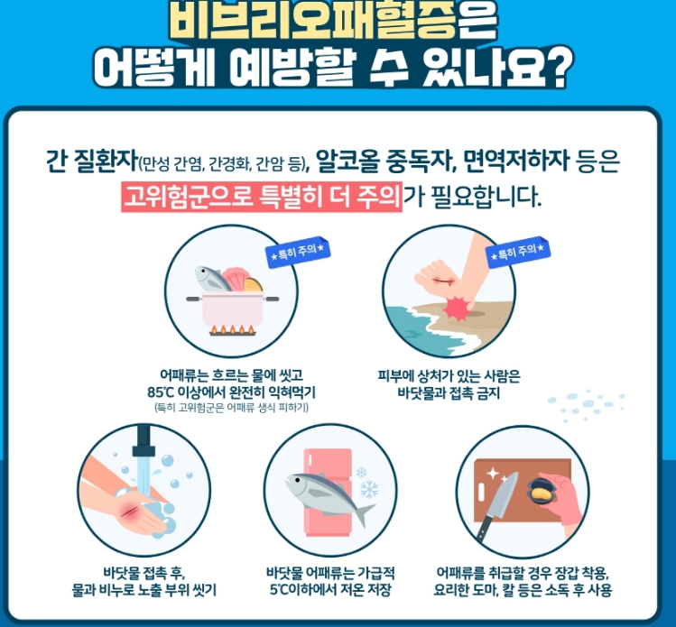 비브리오패혈증을 예방하기 위해서는 ▲어패류는 반드시 충분히 익혀 먹기 ▲어패류는 5℃ 이하에서 저온 보관 ▲상처가 있는 경우 바닷물 접촉 피하기 ▲어패류 손질 시 장갑 착용, 조리기구는 소독 후 사용 ▲어패류 세척 시 해수 대신 수돗물 사용하기 등을 준수해야 한다.