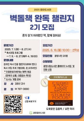 ‘벽돌책 완독 챌린지’는 두꺼운 도서를 참가자들과 함께 정해진 기간 내에 꾸준히 읽고, 온라인을 통해 독서 소감을 나누는 독서 프로그램이다.