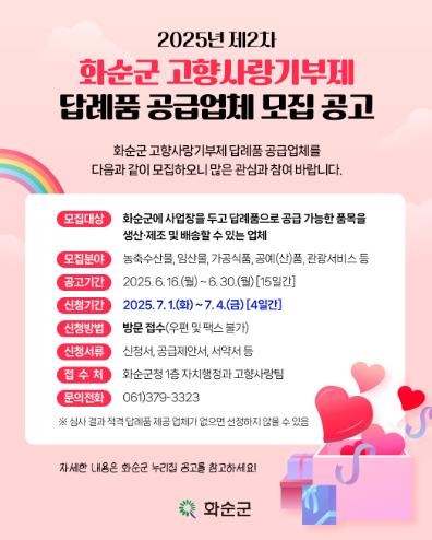 모집 대상은 화순군에 사업장을 두고 답례품으로 공급이 가능한 품목을 안정적으로 생산·제조 및 배송할 수 있는 업체이다.