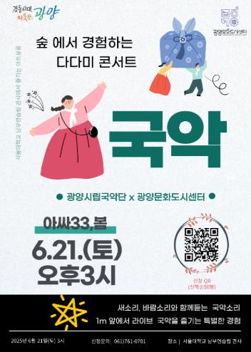 국악단은 '김죽파류 가야금 산조', '청성자진한잎', '가야금이 있는 풍경', '키 큰 나무숲', '신쾌동류 거문고 산조', '무영탑', '미로' 등 다양한 곡을 준비했으며, 서울대 남부연습림 관사의 고유한 공간감과 어우러지는 생생한 국악의 울림이 관객들에게 깊은 감동을 전할 것으로 기대된다.