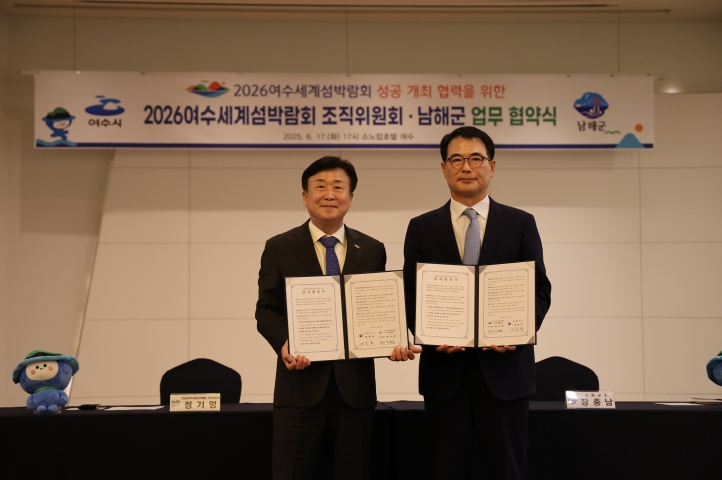 정기명 조직위원장은 “남해는 섬 관광과 해양 생태 자원을 풍부하게 갖춘 여수의 소중한 파트너”라며, “이번 협약을 통해 두 지역이 서로의 강점을 결합해 세계적인 해양관광 콘텐츠를 만들어가길 기대한다.”고 밝혔다.