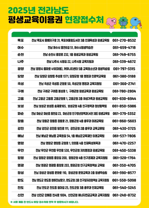 이용권 신청과 사용 방법 등 자세한 내용은 전남인재평생교육진흥원 평생교육팀에 문의하거나 전남도 평생교육이용권 누리집 공고 등을 통해 확인할 수 있다.