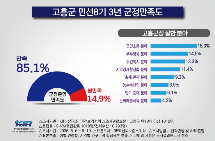 한편, 이번 조사는 여론조사 전문기관인 ㈜코리아정보리서치에 의뢰해 고흥군에 거주하는 만 18세 이상 남녀 1,010명을 대상으로 유선 전화 면접조사와 자동응답 방식을 병행해 진행했으며, 표본오차는 95% 신뢰수준에 ±3.1%p다.