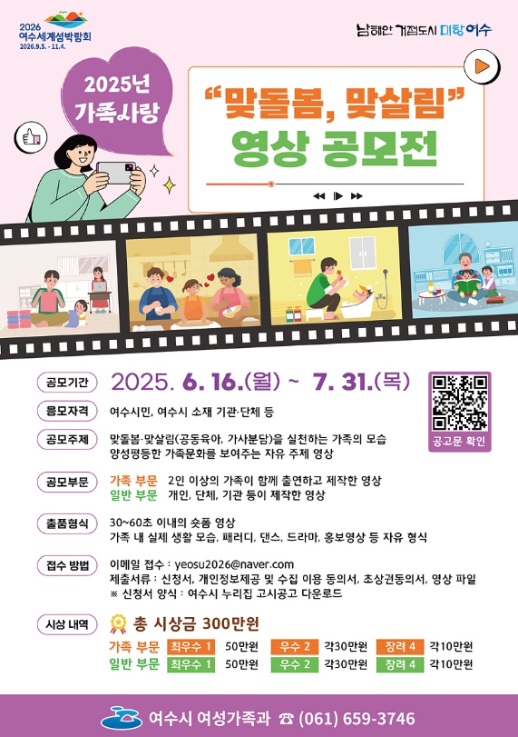 시 관계자는 “가족 구성원 모두가 함께 육아하고 함께 살림하는 맞돌봄·맞살림 문화가 자연스럽게 자리 잡길 기대한다”며 “이번 공모전에 시민들의 많은 관심과 참여를 부탁드린다”고 전했다.