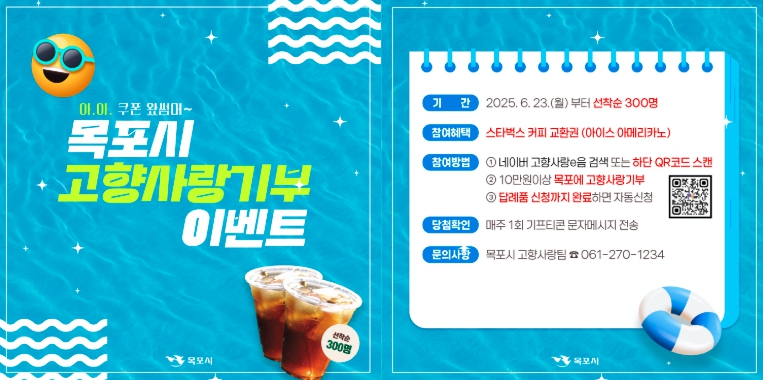 이번 이벤트는 목포시에 10만 원 이상 기부하고 답례품까지 신청하면 별도 신청 없이 자동으로 응모되며, 선착순 300명에게 스타벅스 아이스 아메리카노 모바일 교환권(5,000원 상당)이 제공된다.