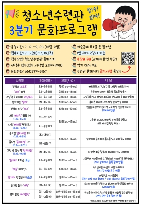 3분기 프로그램은 7월 17일부터 9월 28일까지 운영되며, 화순군에 주소를 둔 청소년은 누구나 참여할 수 있다. 신청은 7월 5일(토)~10일(목)까지 화순군청소년수련관 누리집 프로그램 신청 게시판’을 통해 온라인으로 접수하면 된다. 인기 강좌의 경우 조기 마감될 수 있기에 관심 있는 청소년은 서둘러 신청하고, 참가 확정자는 추후 문자 안내가 이루어질 예정이다.