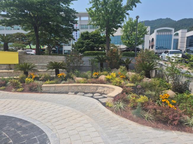 화단에는 루드베키아, 수국, 소철, 남천, 황금사철, 루피너스 등 다양한 수목과 화초류가 식재돼 사계절 내내 볼거리를 제공할 예정이며, 호피석으로 조성된 관람석은 입체적인 경관과 이용자 편의를 동시에 고려했다.