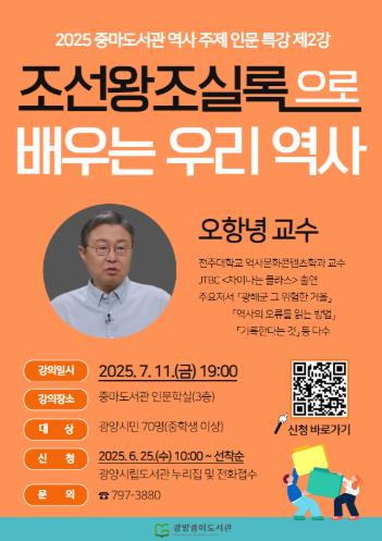 이번 특강은 '2025년 중마도서관 역사 주제 인문 특강'의 두 번째 강연으로, 지역 시민들의 역사 이해를 돕고 역사 인문학에 대한 관심을 높이기 위해 마련됐다.