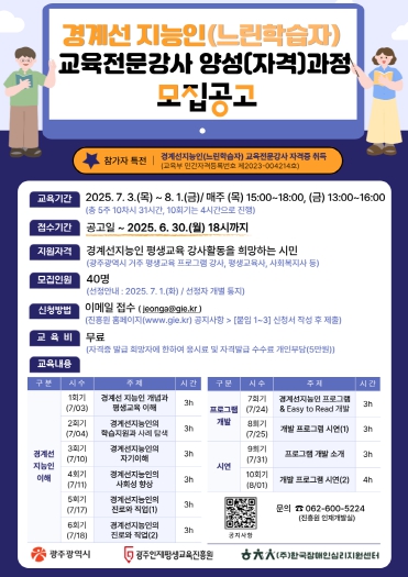 이번 과정은 광주시와 진흥원이 주관하고 ㈜한국장애인심리지원센터에서 운영을 담당하며, 경계선지능인 대상 평생교육 강사 활동을 희망하는 평생교육 강사, 평생교육사 또는 사회복지사 등을 대상으로 한다.