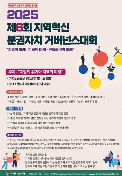 여수시와 전라남도, 거버넌스센터 등이 공동 주최하는 이번 행사는 ‘지역의 위기와 지역의 미래’를 주제로 지역소멸, 기후 위기 등 지역사회가 직면한 다양한 현안을 논의하고 협력 방안을 모색하는 데 목적을 둔다.