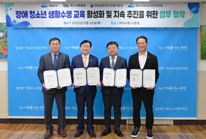 시는 지난 26일 여수시체육회, 전라남도여수교육지원청, 여수시청소년해양교육원과 장애 청소년 생활수영 교육 활성화 및 지속 추진을 위한 업무협약을 체결하고 ‘장애 포용형 생활수영 교육 모델’ 구축을 본격화했다.