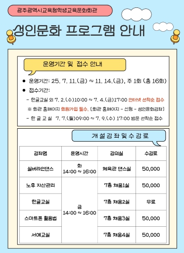 단, 비문해 성인을 위한 기초문해교육 과정인 한글교실은 7월 7일 오전 9시부터 방문 접수만 받으며, 수강료는 없다.