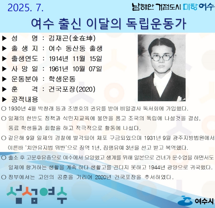 한편, 여수시는 지역 출신 독립운동가의 역사적 가치를 재조명하고 독립 정신 확산을 위해 지난 2022년 8월부터 독립운동가유족회와 공동으로 여수 출신 독립운동가를 발굴·선정해 홍보하고 있으며 현재까지 83명을 추서했다.