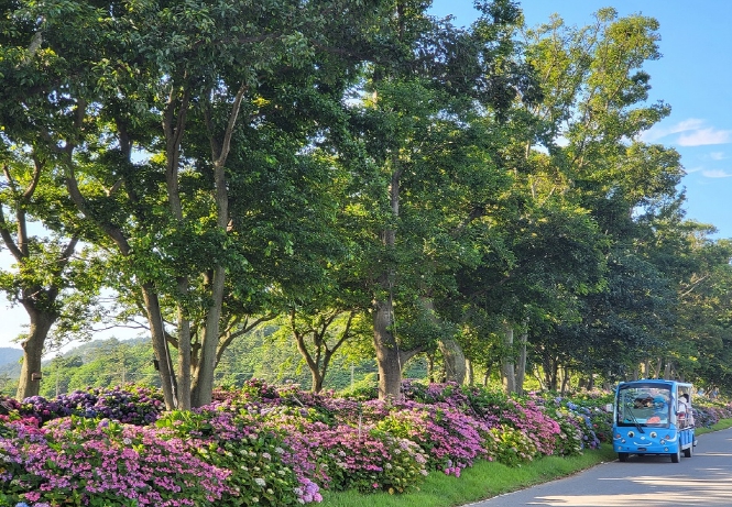 2019년부터 이어져 온 ‘섬 수국축제’는 지난 6월 20일을 시작으로 10일간 열렸으며, 관람객들은 1억 송이의 수국정원과의 만남을 위해 4km에 이르는 팽나무 숲길을 따라 양쪽으로 핀 수국과 동행하며, 느림의 미학과 함께 인생 한 컷을 남기며 축제장에 도착한다.