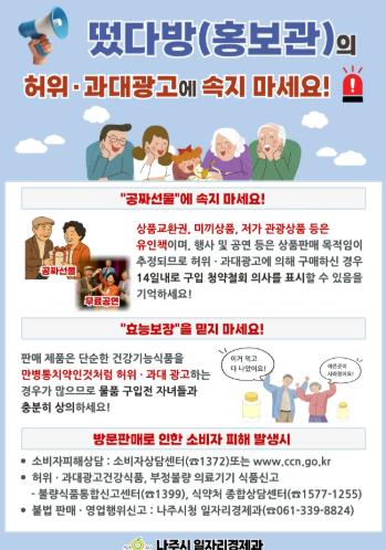 나주시 관계자는 “떴다방과 같은 불법 방문판매는 단순한 상술이 아닌 시민 재산을 위협하는 행위”라며 “고령층 등 취약계층을 중심으로 발생하는 피해를 막기 위해 읍면동과 협력해 예방 교육과 홍보를 강화하겠다”고 밝혔다.