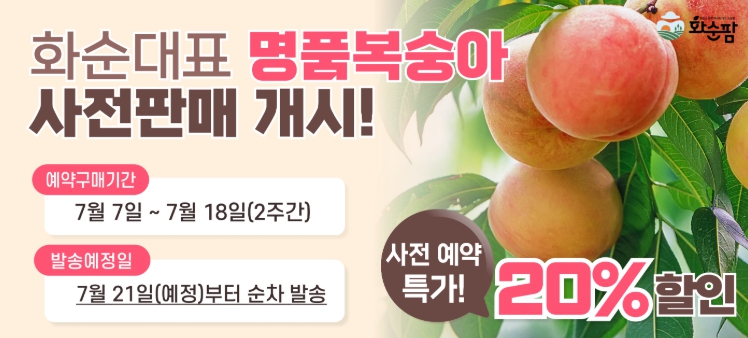 이번 행사는 화순군의 여름 대표 과일인 복숭아의 전국적 홍보와 판매 활성화를 위해 정상 판매가보다 20% 할인된 금액으로 사전 예약결제를 받은 후, 복숭아가 본격 출하되는 21일부터 순차적으로 배송할 예정이다.
