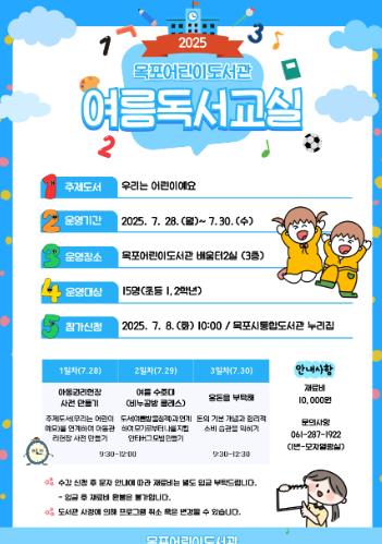 참가 신청은 7월 8일부터 목포시통합도서관 누리집을 통해 가능하며, 자세한 사항은 목포어린이도서관으로 문의하면 된다.