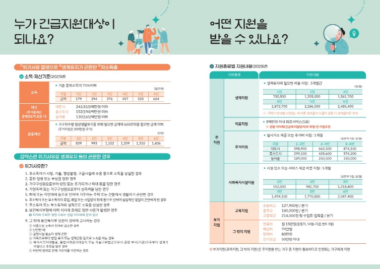 긴급복지 지원은 주 소득자의 실직, 사망, 중한 질병・부상, 화재, 휴・폐업 등 위기상황 발생으로 생계유지가 곤란한 저소득 가구에 생계비, 의료비, 주거비, 복지시설 이용, 교육비, 해산비 등을 지원하는 제도로 거주지 관할 읍・면사무소나 입원 치료 중인 의료기관을 통해 신청할 수 있다.