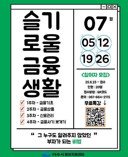 첫 번째 강좌는 실생활과 밀접한 금융 교육 ‘슬기로울 금융생활’로 7월 5일부터 26일까지 4주간 매주 토요일 오전 10시 30분부터 12시까지 여수시청년지원센터 회의실에서 운영된다.