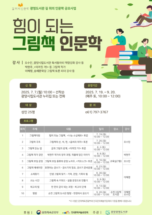 본 프로그램은 광양시립도서관이 문화체육관광부가 주최하고 한국문화예술위원회가 주관하는 ‘2025년 길 위의 인문학’ 공모사업에 선정되며 기획됐다.