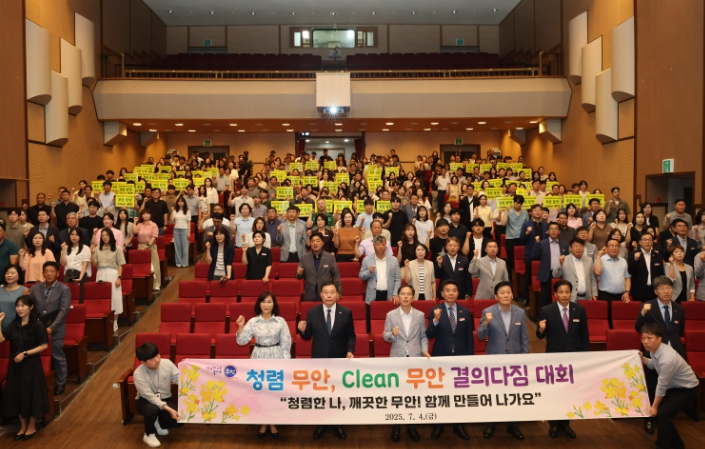 이번 결의다짐 대회에는 무안군 공직자 800여명이 참여해 법과 원칙을 지키는 청렴한 자세와 깨끗하고 청결한 ‘클린무안’을 조성하는데 앞장서겠다는 실천 결의문을 낭독하고 카드섹션 퍼포먼스로 다짐을 공유하는 시간을 가졌다.