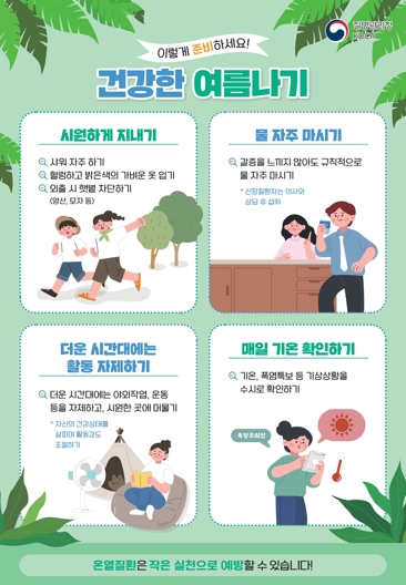 온열질환은 고온의 환경에서 발생하는 열사병, 열탈진, 열경련 등으로 고령자, 야외근로자, 어린이, 만성질환자는 특별한 주의가 필요하다.