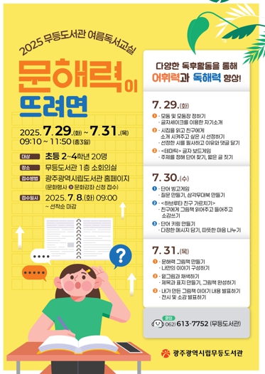 무등도서관은 초등학교 2~4학년 20명을 대상으로 독해력과 어휘력을 키우는 활동형 수업을 운영한다. ‘문해력이 뜨려면’을 주제로, 시 필사, 글자 보드게임, 나만의 그림책 만들기 등을 활용한 문해력 향상 프로그램을 진행한다.